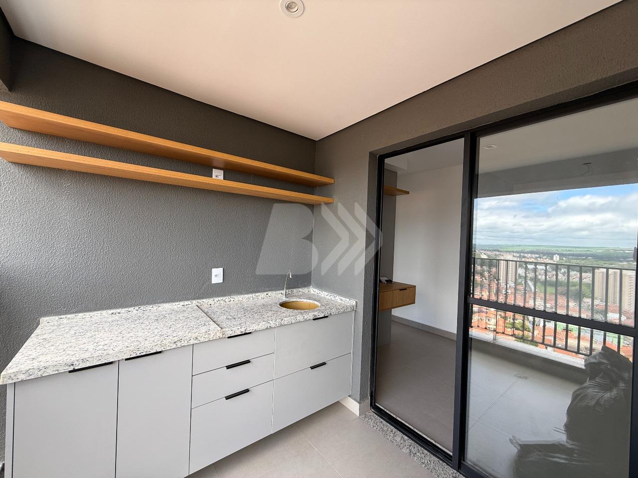 O imóvel conta com sala para 2 ambientes com painel de televisão e sacada com armário.