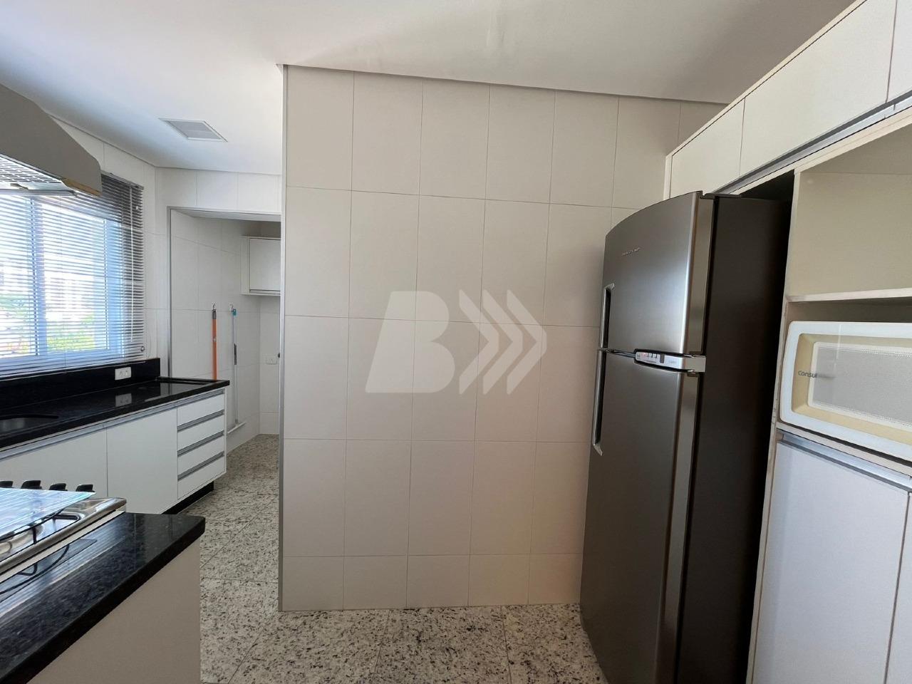 Conta com sala para 2 ambientes com painel de TV, sofá e mesa, cozinha planejada com pia em granito, equipada com fogão, geladeira e micro-ondas, além de área de serviço com armários.