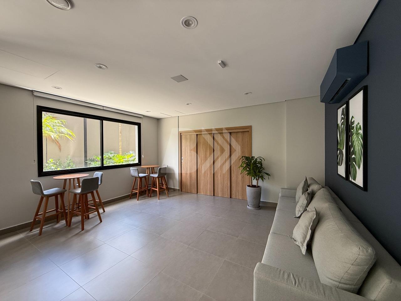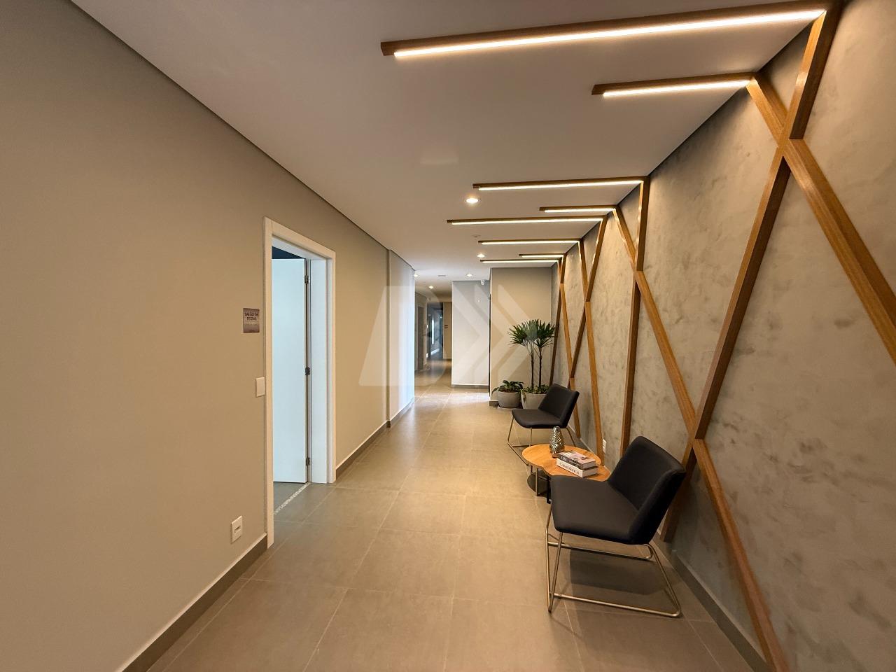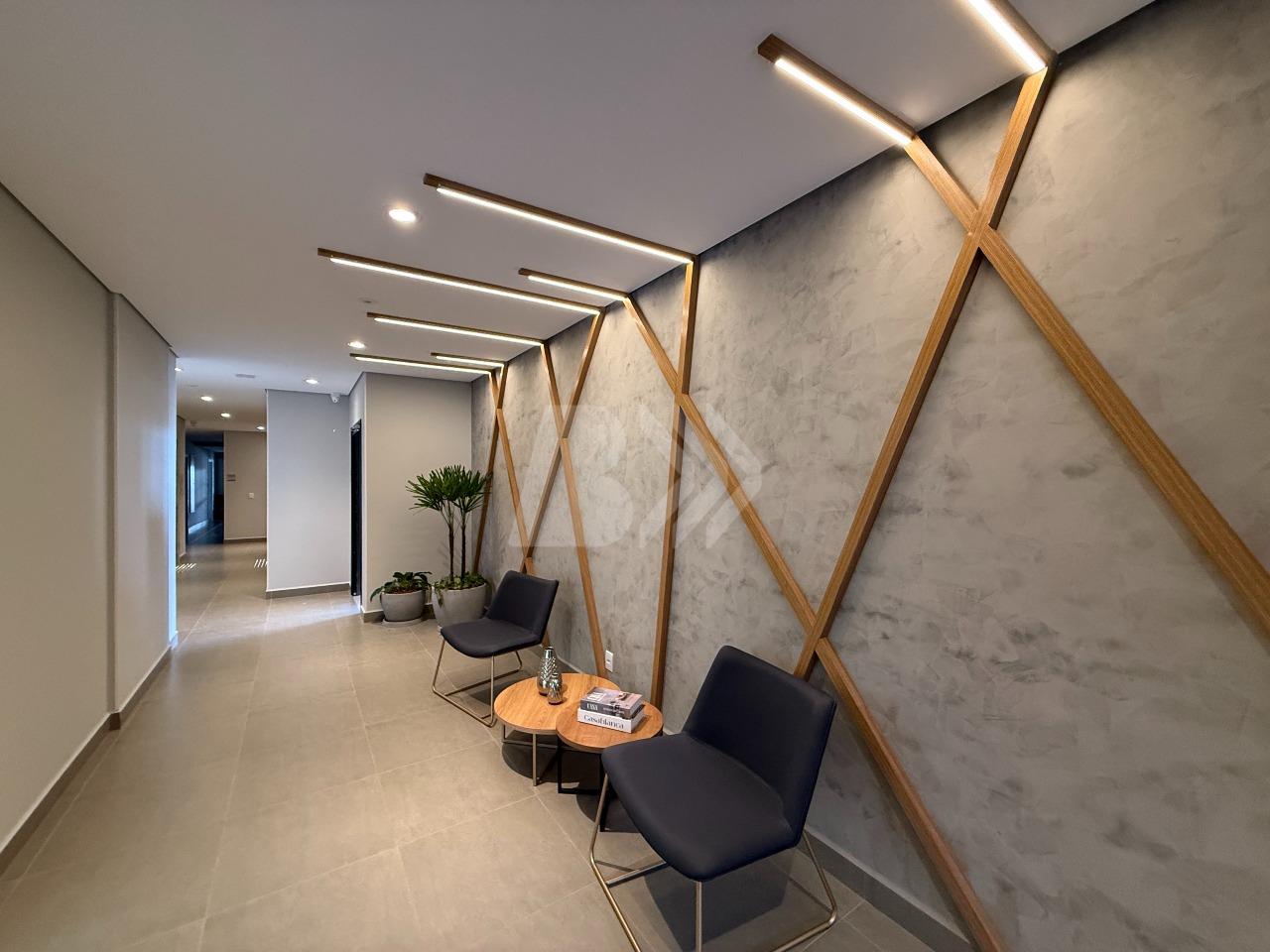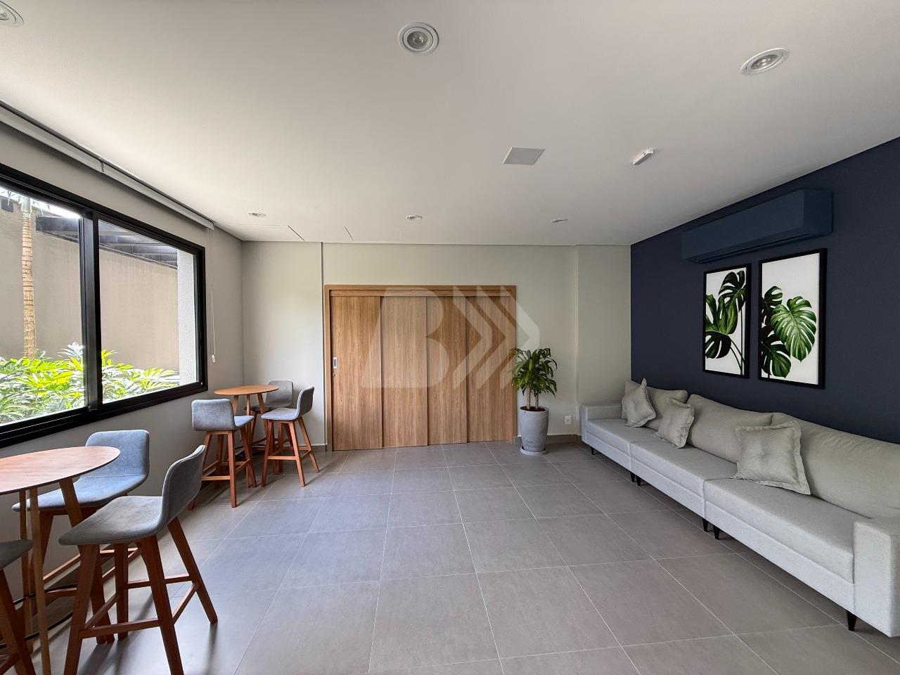O imóvel conta com sala para 2 ambientes com painel de televisão e sacada com armário.
