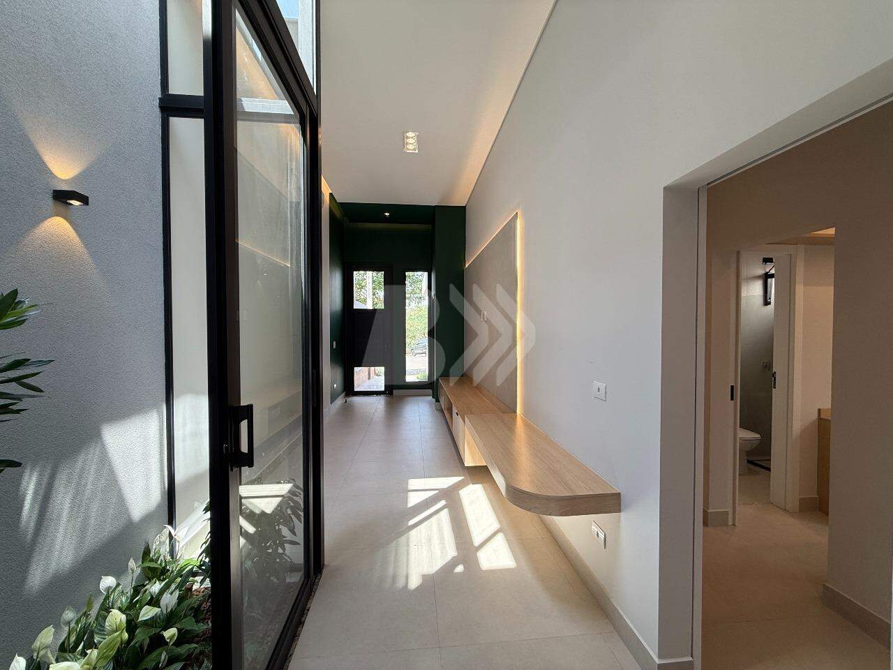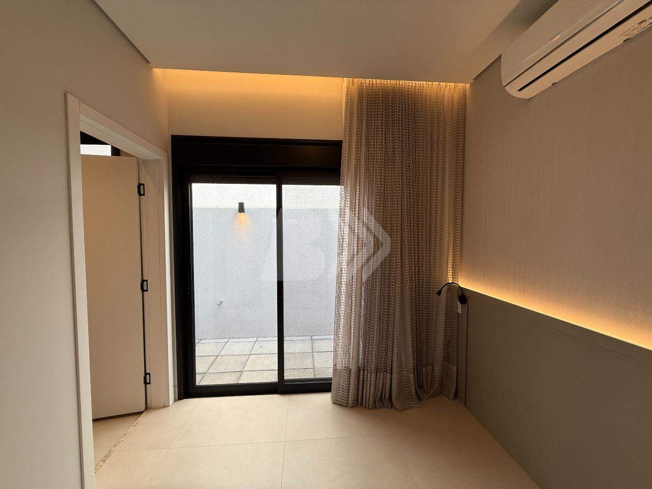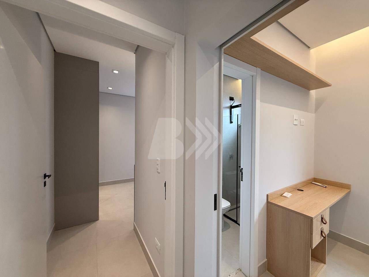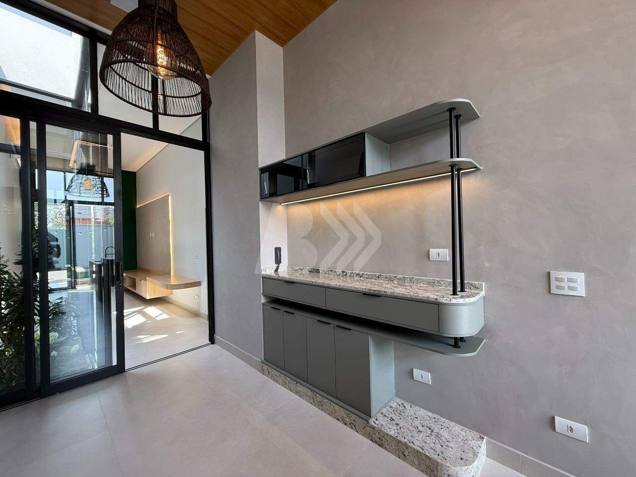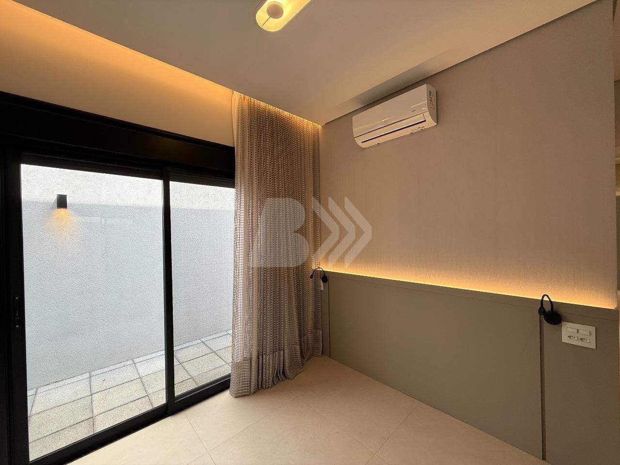 Conta com hall de entrada, sala de estar, lavabo, home office, jardim de inverno, sala de jantar integrada com barzinho e cozinha gourmet, piscina com borda infinita de vidro, banho, casa de máquinas, 3 quartos, sendo os 3 suítes, e lavanderia com depósito.