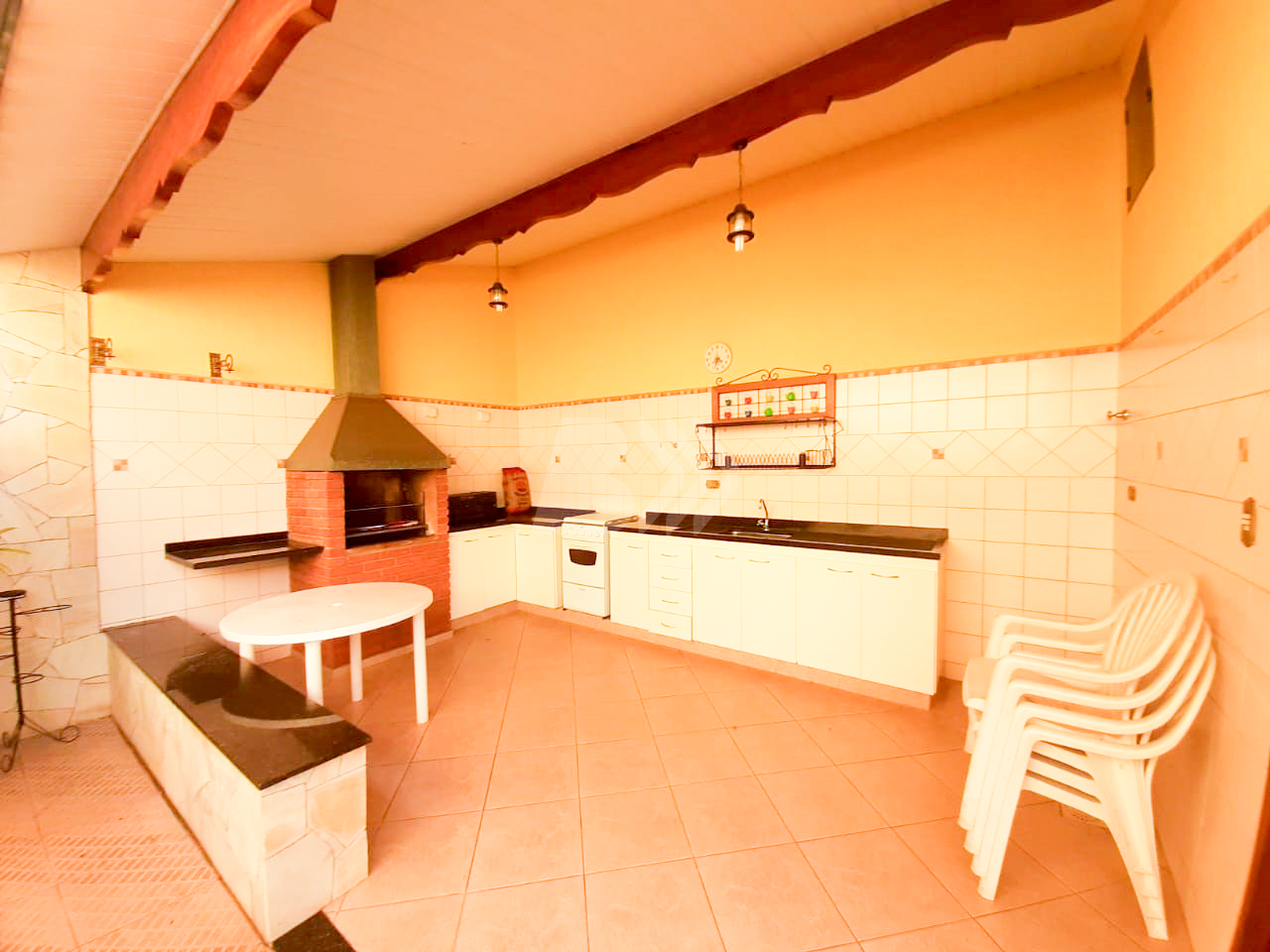 O imóvel apresenta cozinha com gabinete e armário, na área externa consta lavanderia, quintal com área gourmet e quarto de despejo.